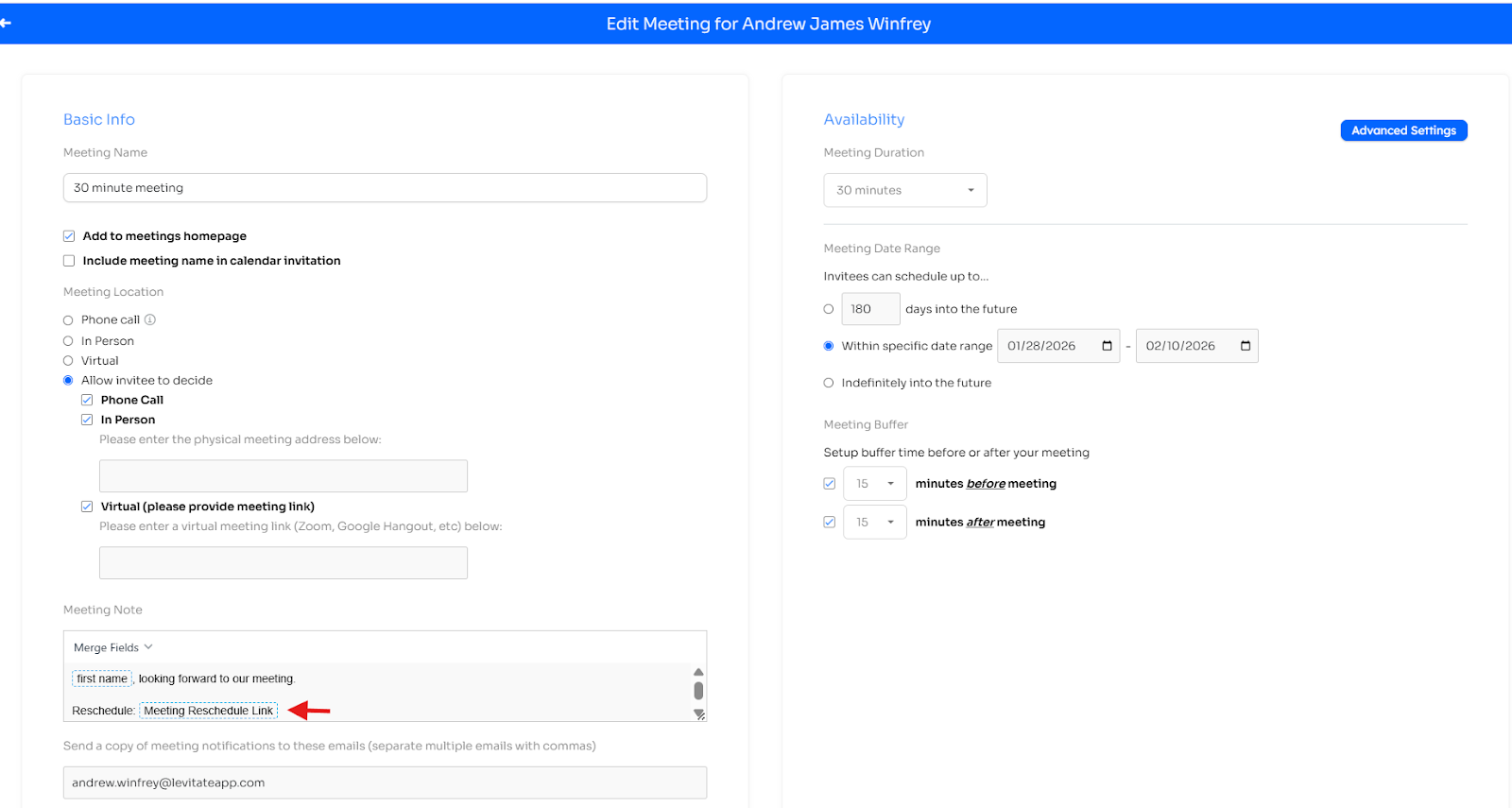 - Check "Meeting Date Range" to confirm invitees can schedule far enough in advance