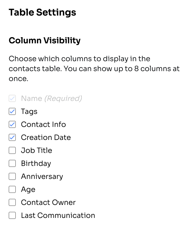From the People page, you can choose Table Settings from the right-hand navigation bar. From there, you'll be able to choose which fields will display in up to eight columns on the People page— Name is always required, and you can also choose to see Tags, Contact, Info, Creation Date, Job Title, Birthday, Anniversary, Age, Contact Owner, and Last Communication. Once you choose up to eight of these fields, your People page will always show those choices, but you can change them and update them as often as you'd like.