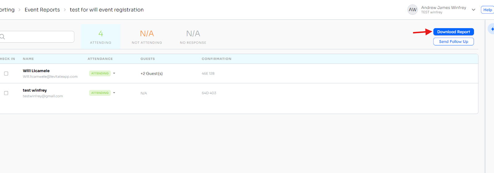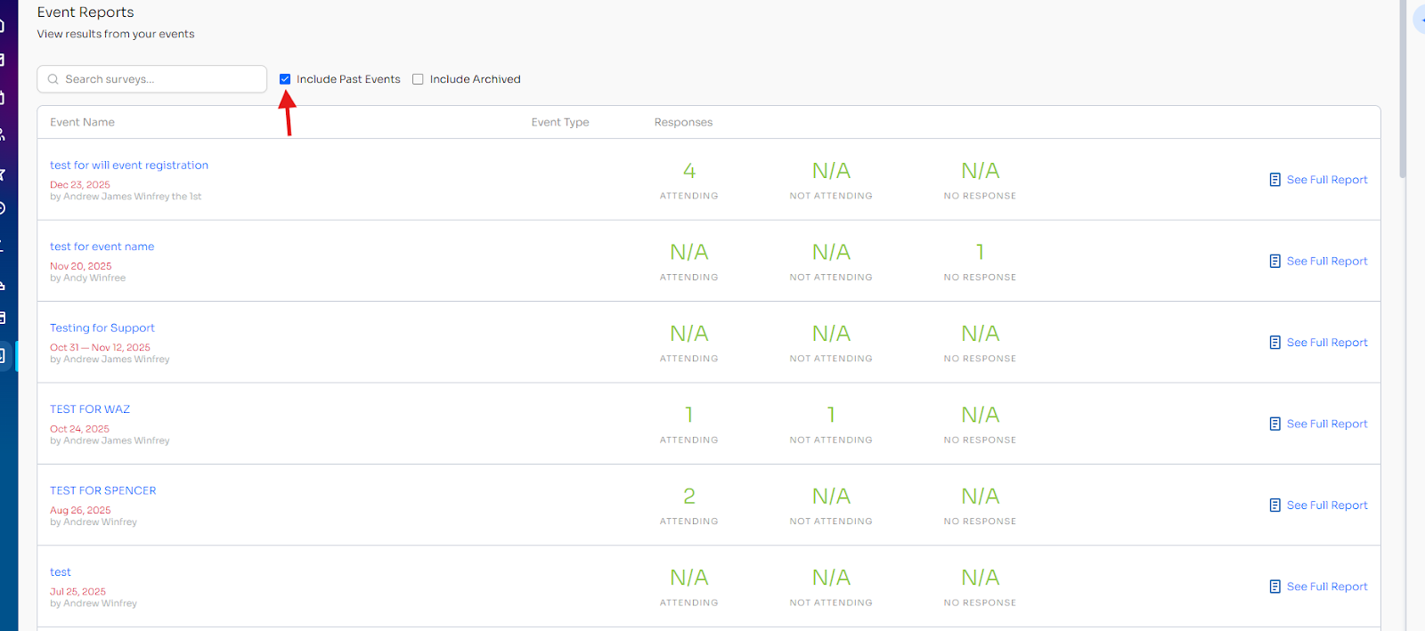 Each event will have its own line and full report. All answers, including answers to custom questions, will be recorded in the report. The report will also show which attendees have been checked in using the above methods.