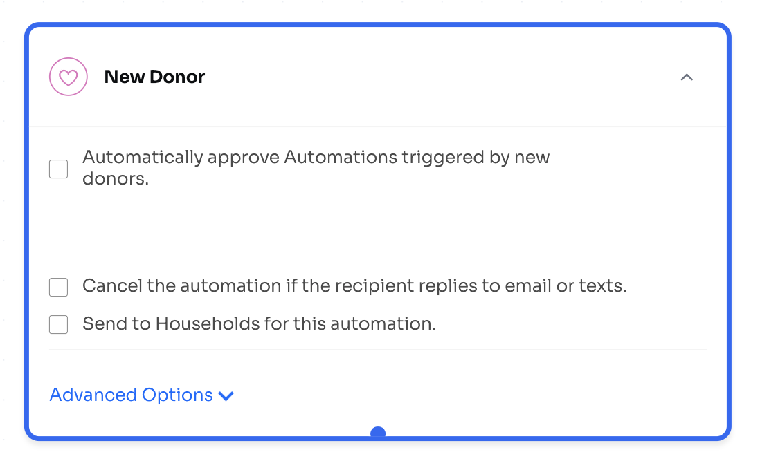 Similar to our new client automation, the New Donor Automation can be made fully hands off by choosing 'Automatically approve Automations triggered by new donors.' If this goes unchecked, each new donor will be identified through a dashboard card and need to be manually approved by the user. If it is checked, the user will no longer see the dashboard card and each identified contact will be started without manual approval. .