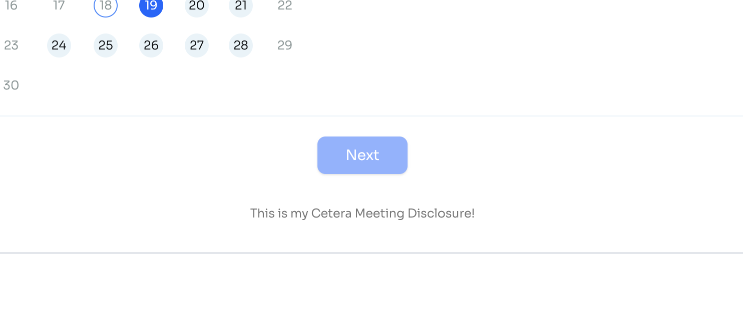There is a text box labeled "Cetera Disclosure." There, you will add your Cetera-approved meeting disclosure. This is what it will look like on each meeting schedule page:
