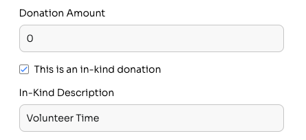 When creating a new donation, the donation amount can be set as zero, the checkbox for 'This is an in-kind donation' can be checked, and a description of the In-Kind donation can be manually typed in. Here's what that looks like: