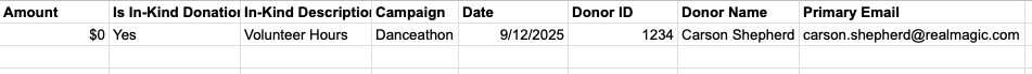 In-Kind Donations are also supported through CSV import. Three fields can define an In-Kind Donation— the Amount will be $0, a column with the header 'Is In-Kind Donation' will say 'yes' for that $0 donation, and a description can be added in its own column with the header 'In-Kind Description.'