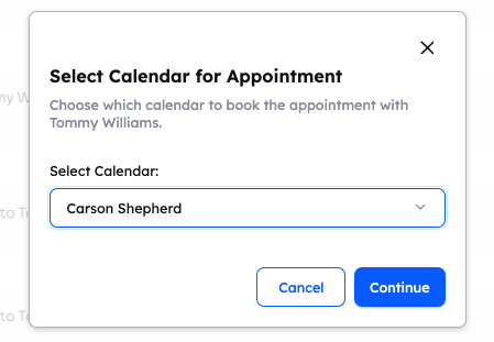Now, when booking a meeting directly through the Contact Profile calendar button, an Admin is able to choose which Levitate user to book the meeting with. When you click the calendar button under the user's name on their contact profile, this is what the new menu will look like: