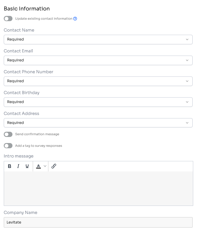 - New dropdown menus for each field, to make each field Required, Collected, or Not Collected on the survey