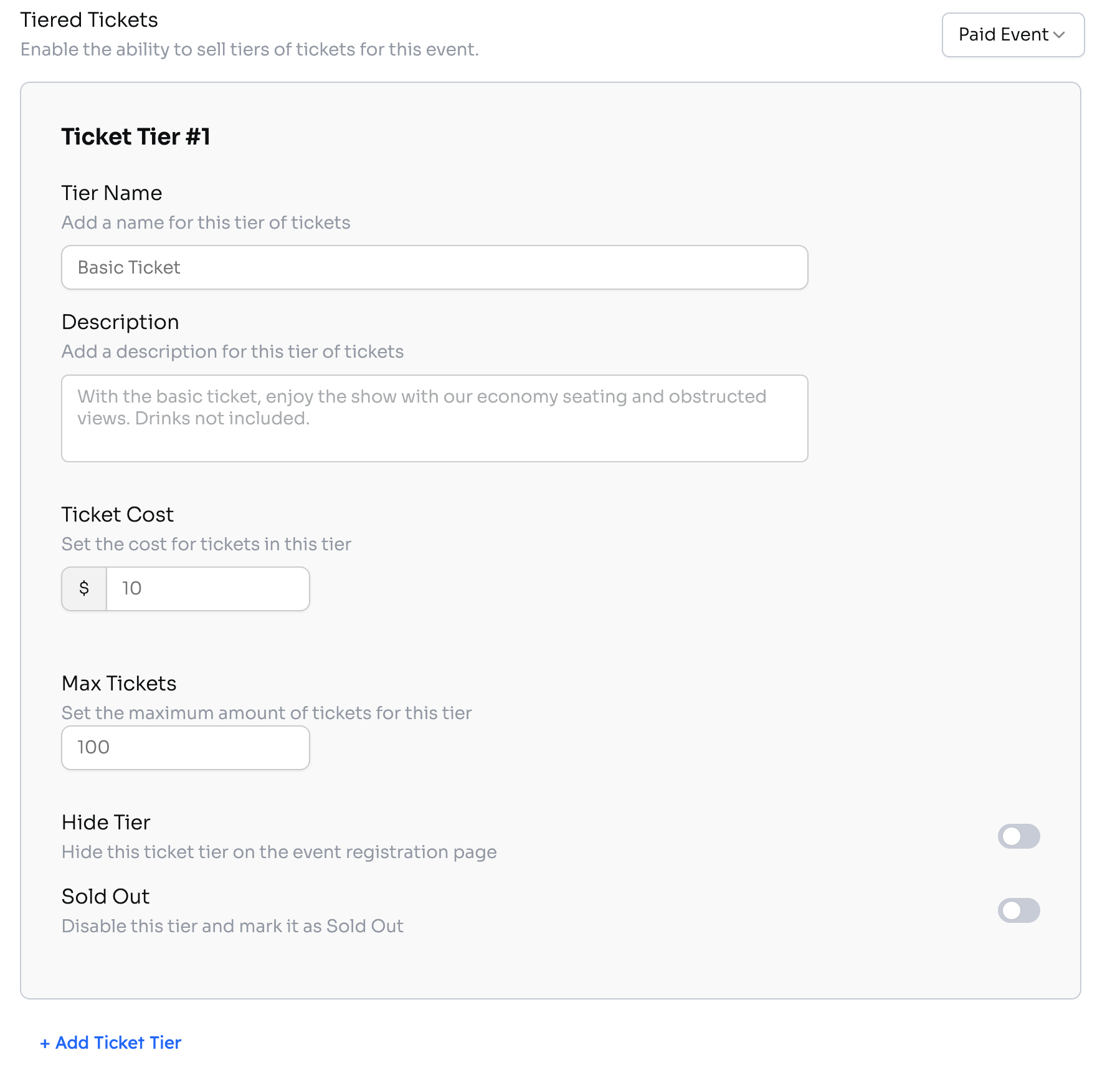 Paid Events can now have one or multiple tiers for ticket payment. Each tier must have a set price and a maximum number of tickets; the tier can also be named and provided with a description.