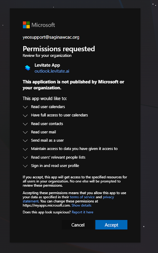 Accounts on Microsoft Office 365 must add Levitate as a verified app to connect to Levitate.