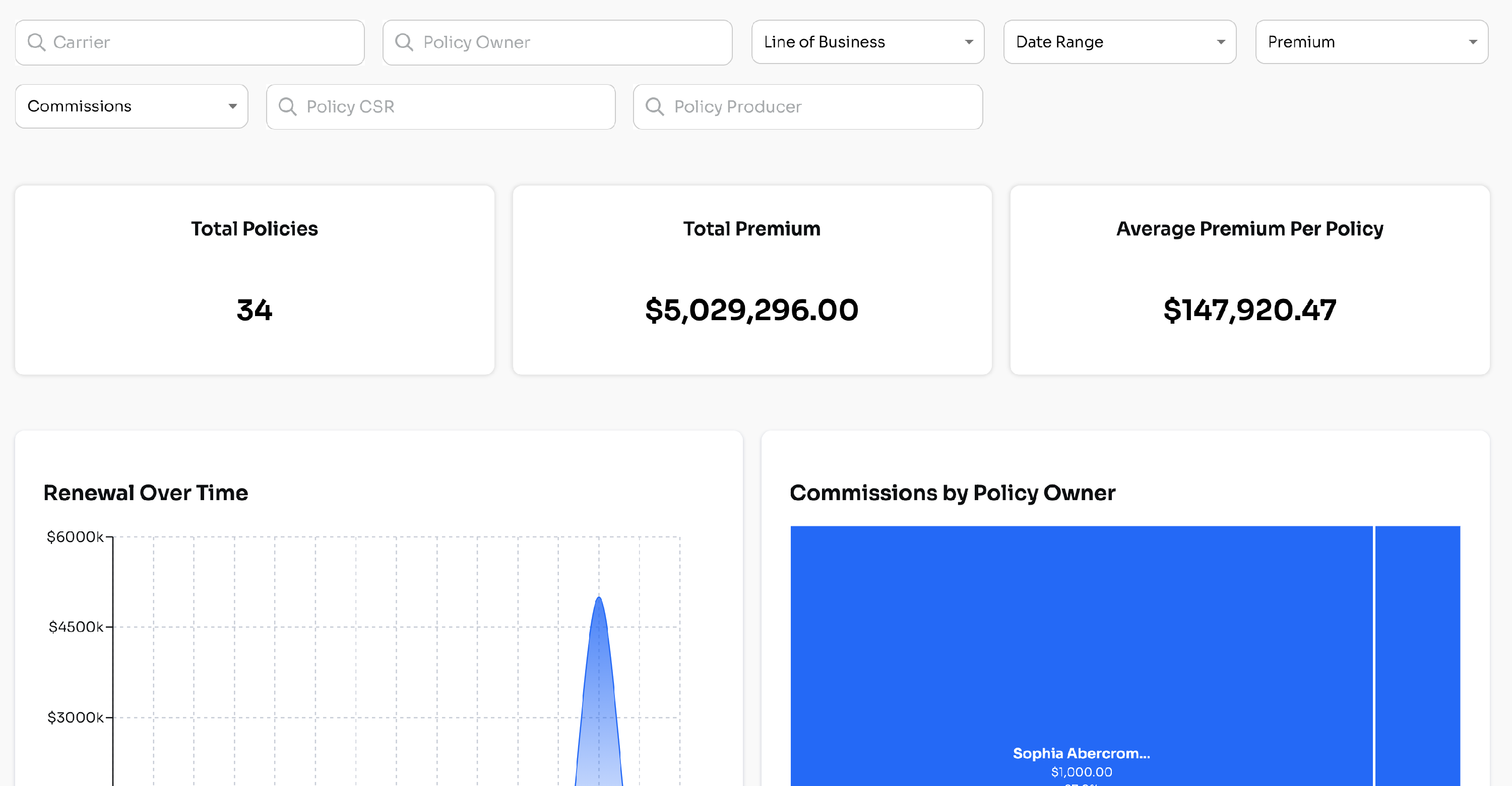 The new dashboard includes the same filtering criteria as the Policy Board, rollups of total premium amounts, and visuals on renewals.