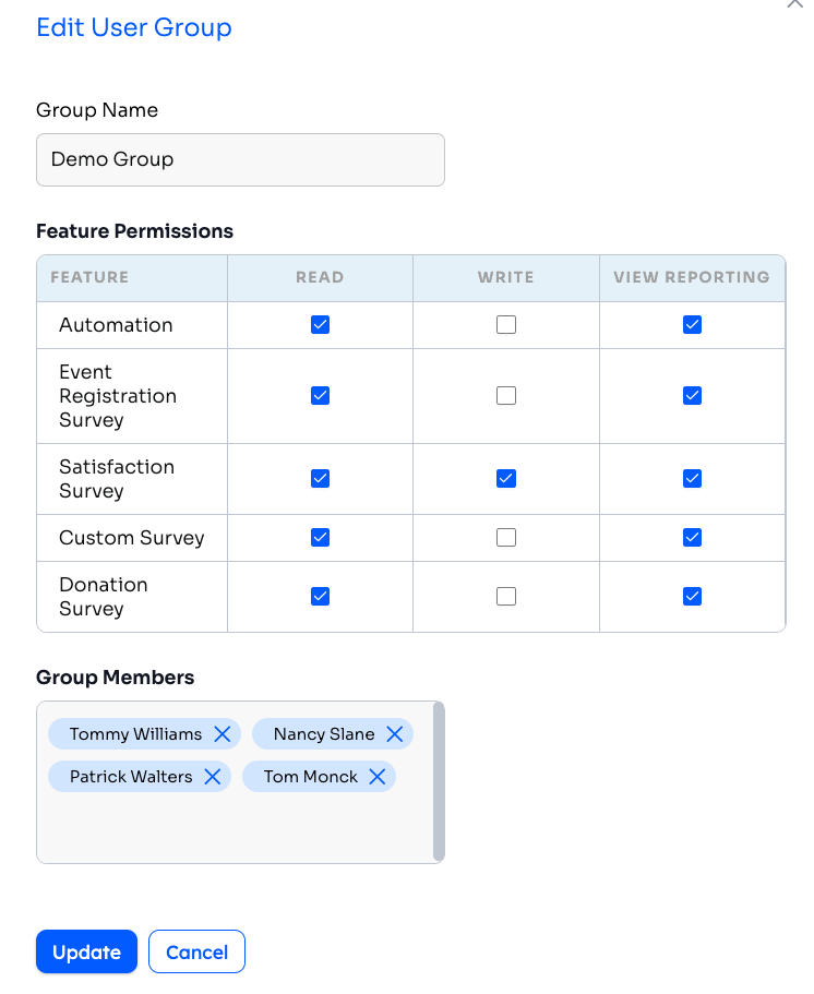 The User Groups feature in Levitate is for account Admins and Super Admins to control which users can access which features. Currently, the ability to view, edit, or see reporting for Automations and all survey types (Satisfaction, Event Registration, Custom, and Donation) can be limited or allowed through User Groups.