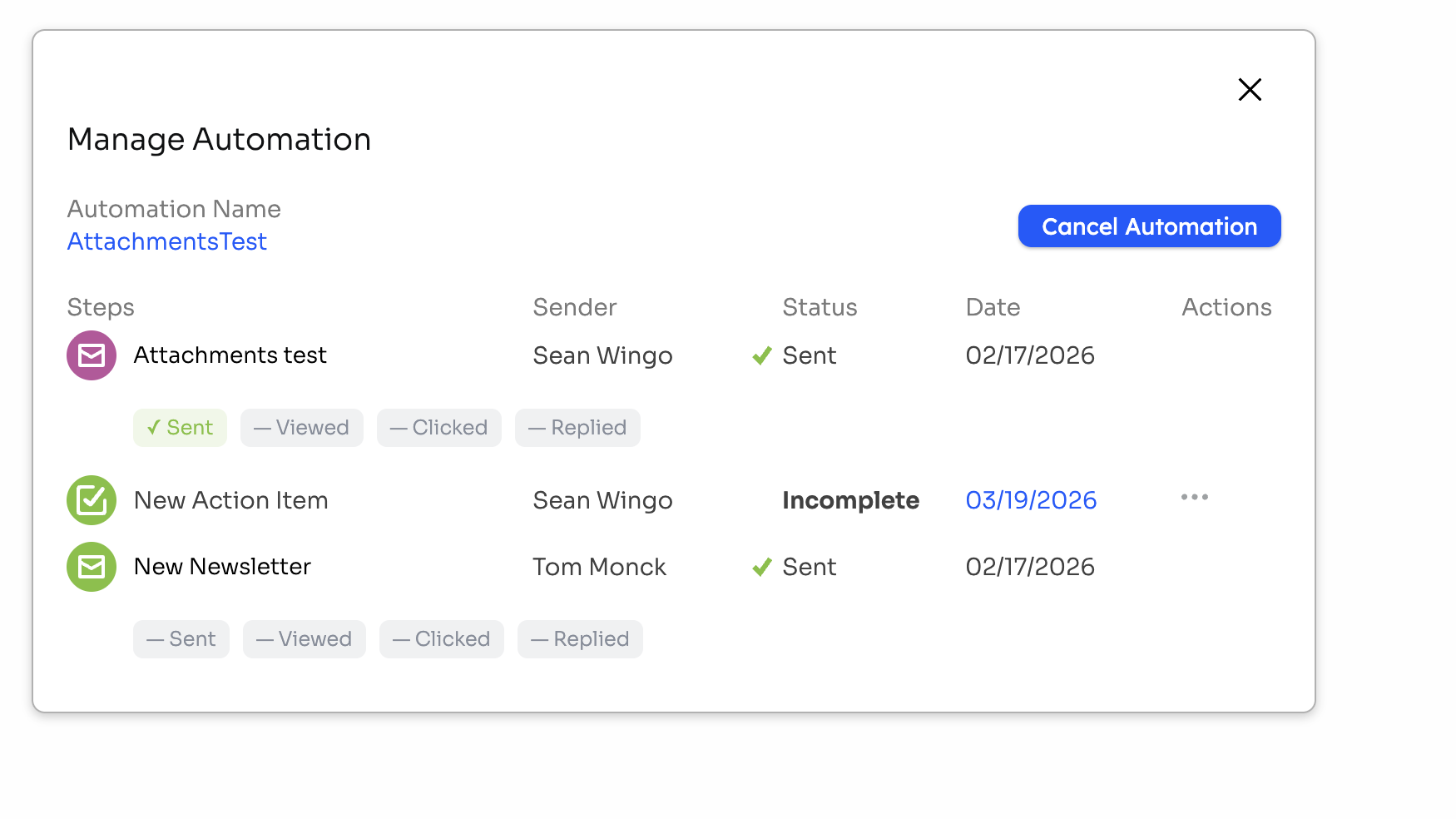 Email tracking information is now available in automation reporting. Users can now see email-related data—such as Sent, Viewed, Clicked, or Replied—in automation reporting.