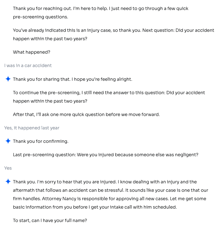 When used for intake, the AI Assistant turns a traditional form into a conversation. Instead of filling out boxes, prospects can simply chat (or even speak) their responses.